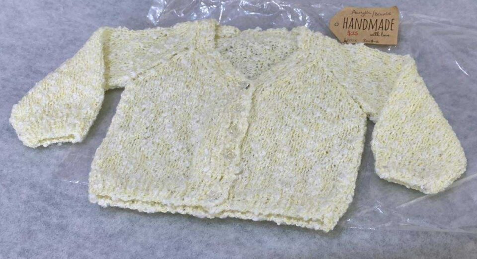 Cream with lemon Flicks Hoodie – Fits 2 – 3 year old.  Made out of acrylic wool – machine washable.